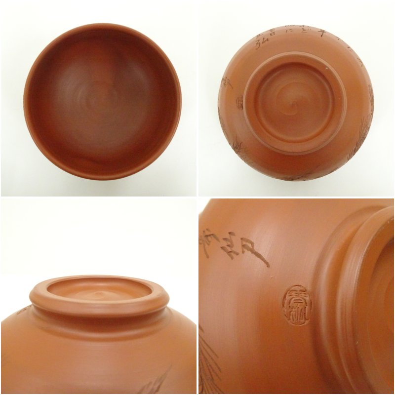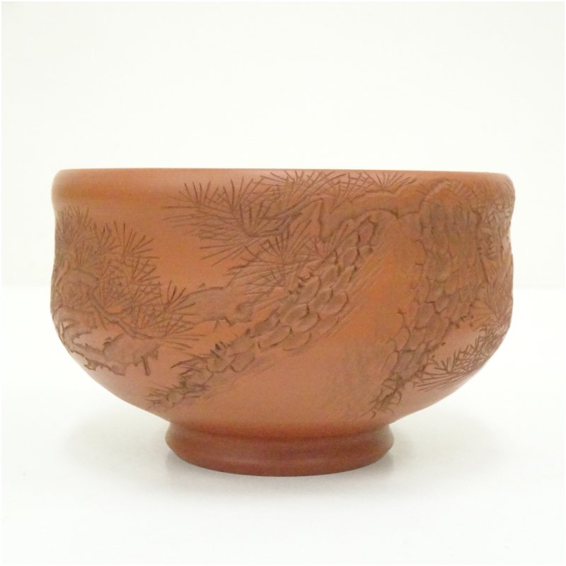 常滑焼 沢田琴松・寿仙造 朱泥松彫茶碗(共箱) [13-250623c-043a]