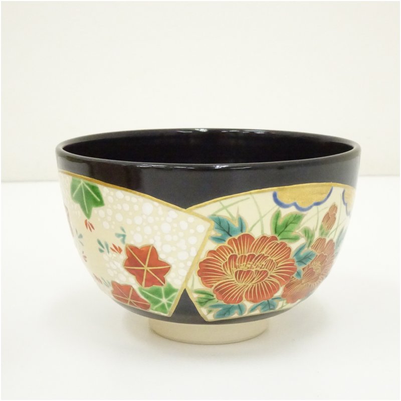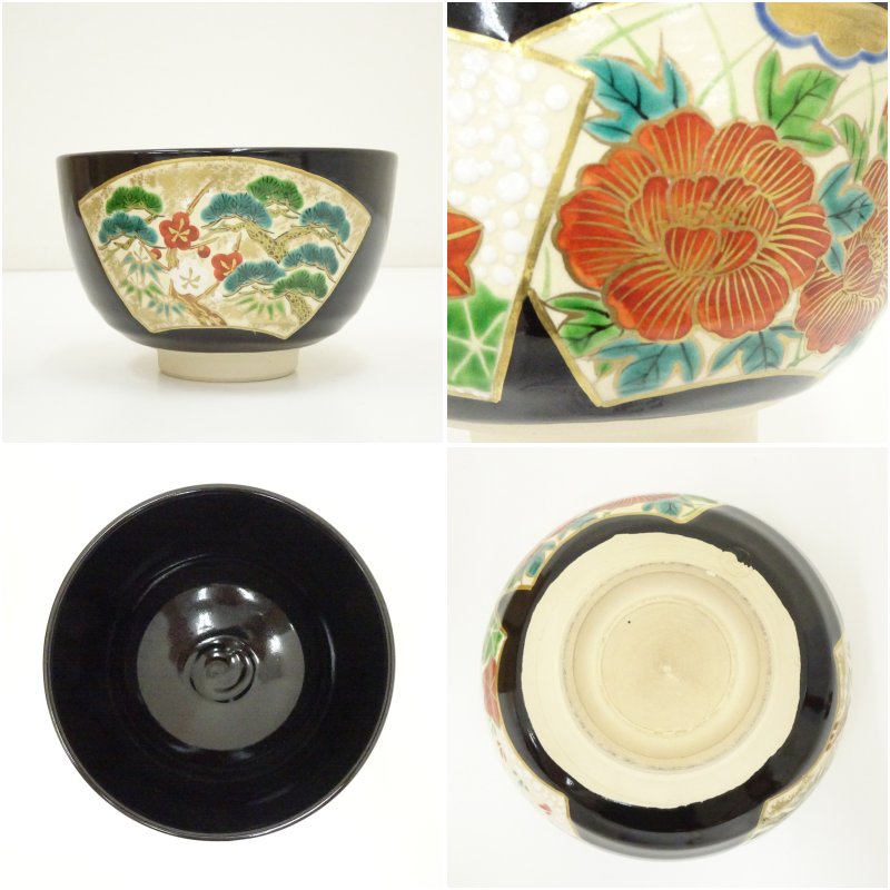 京焼 手塚充造 黒仁清地松竹梅文茶碗(共箱) [13-250623c-060a]