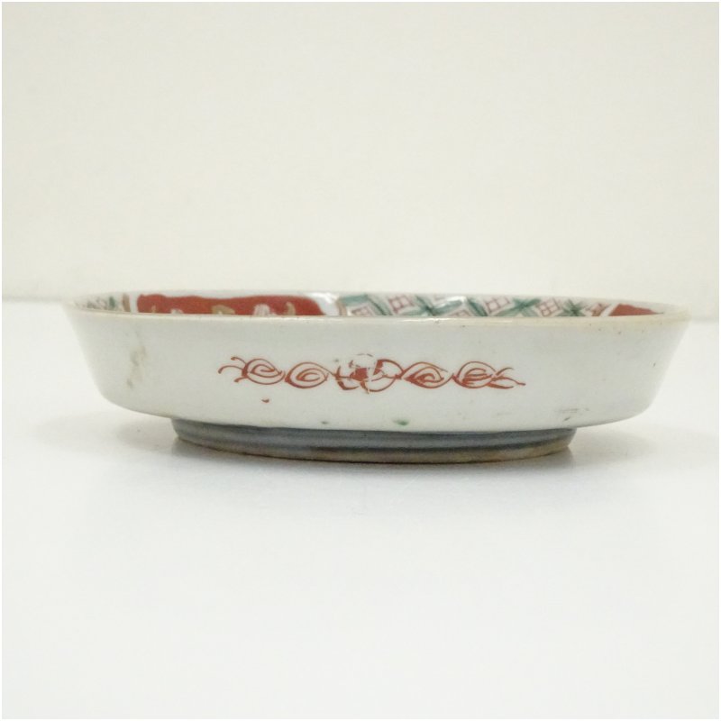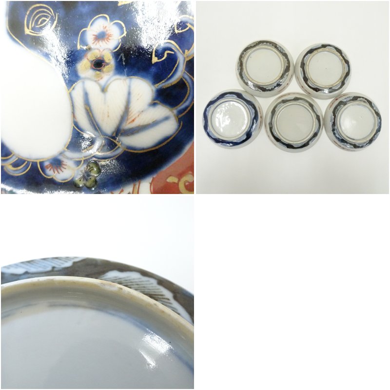 2客の色絵に剥がれがあります。1客の高台に欠けがあります。