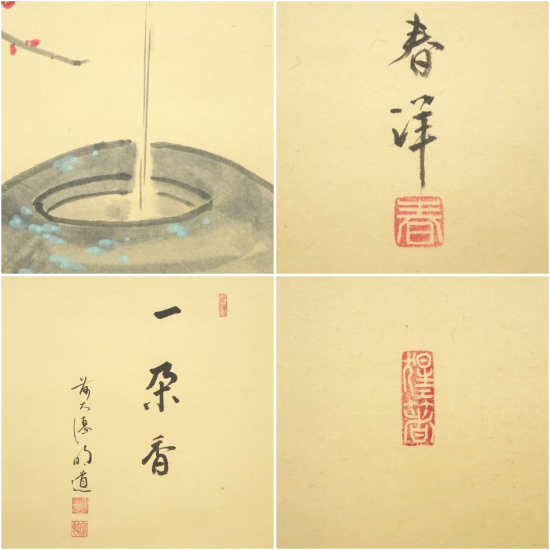 前大徳 戸上明道筆 「一朶香」仲春洋筆 紅梅画賛 肉筆紙本掛軸(共箱) [13-250702c-006a]