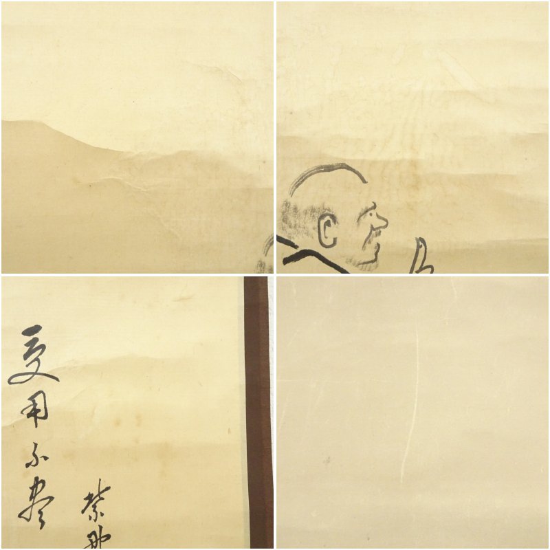 本紙と表具両面に全体的にシミがあり、巻き皺による折れがあります。