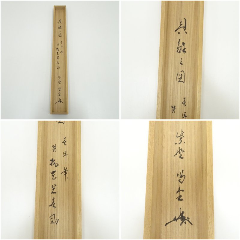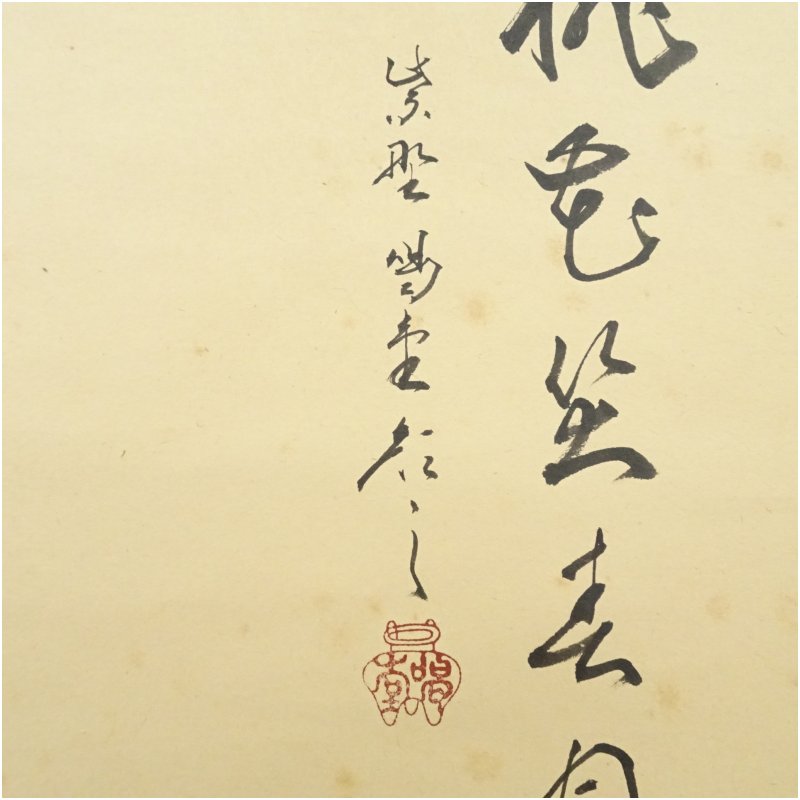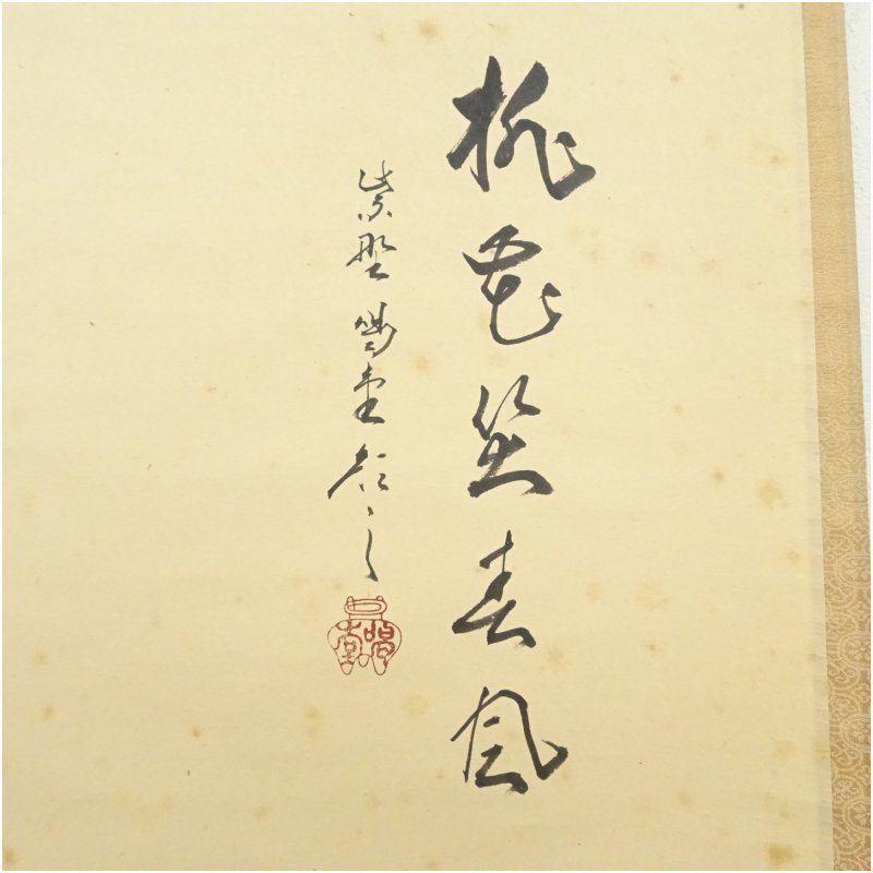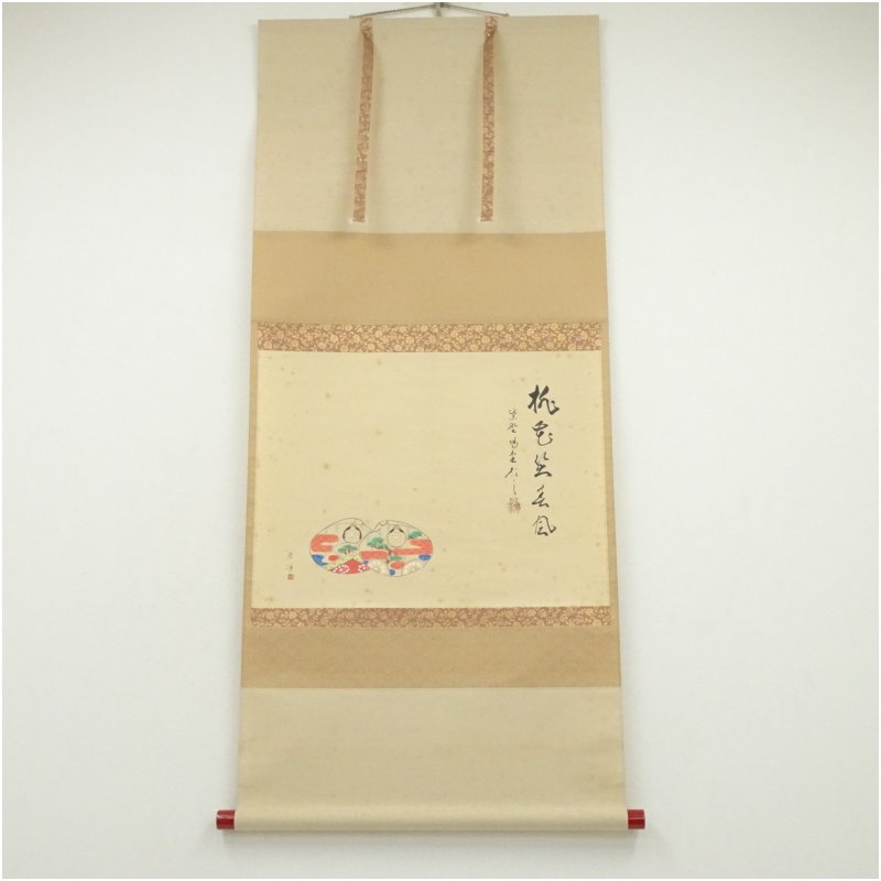大徳寺 細合喝堂筆 「桃色笑春風」春洋筆 貝雛画賛 横物 肉筆紙本掛軸(共箱)