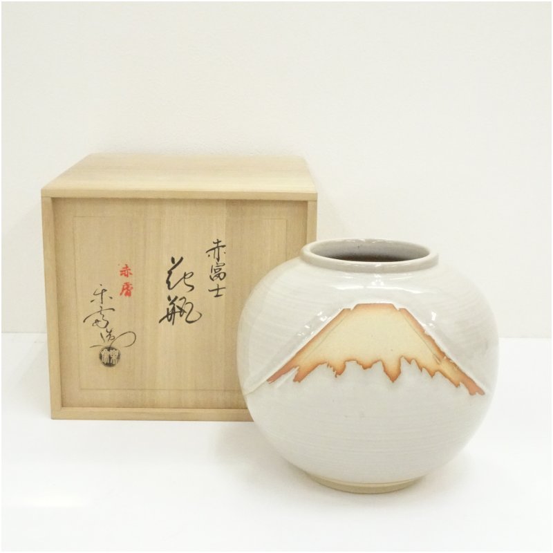 赤膚焼 尾西楽斎造 赤富士花瓶(共箱)