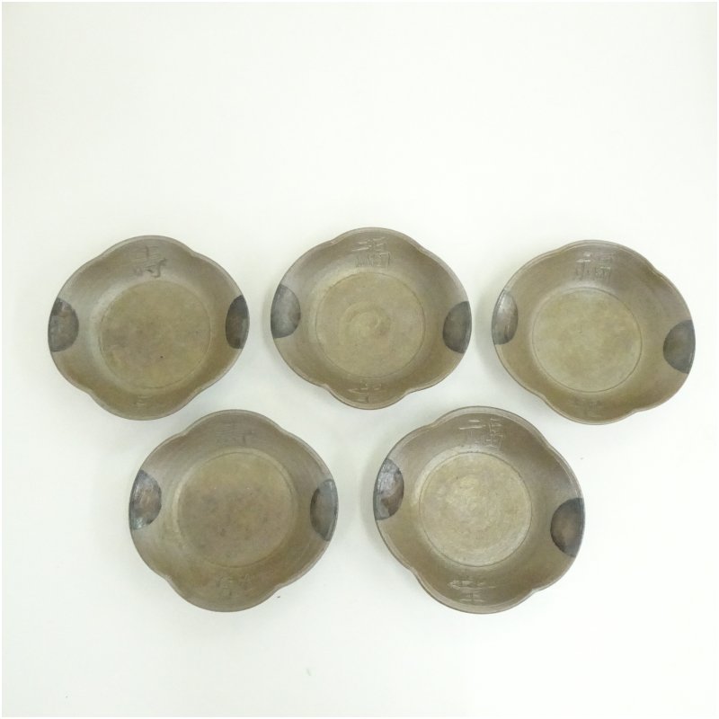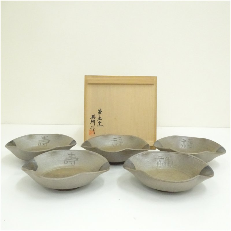 草土窯 福田英明造 焼締銀彩福寿文向付5客(共箱)