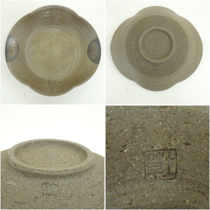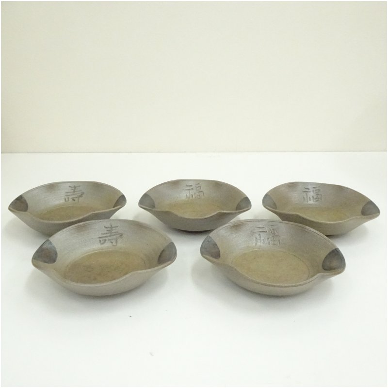 草土窯 福田英明造 焼締銀彩福寿文向付5客(共箱) [13-250718c-002a]