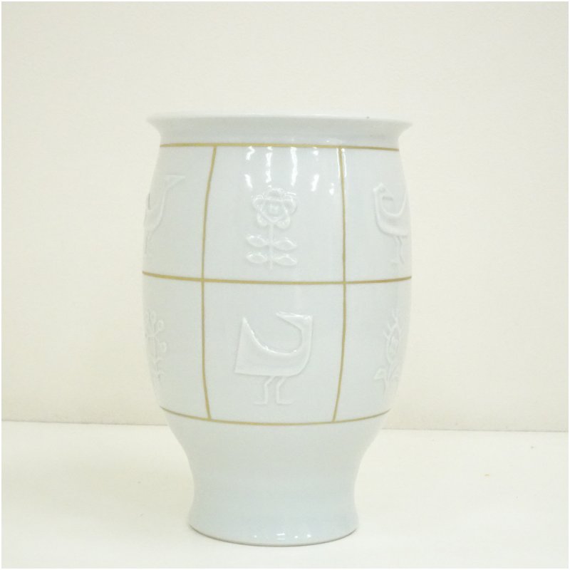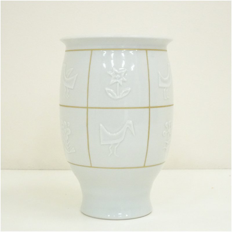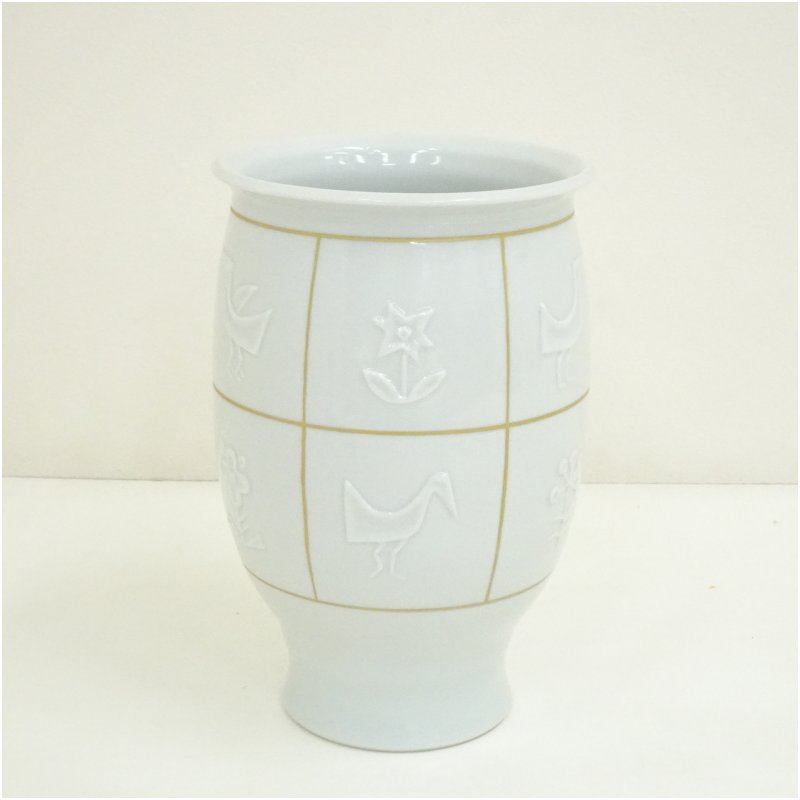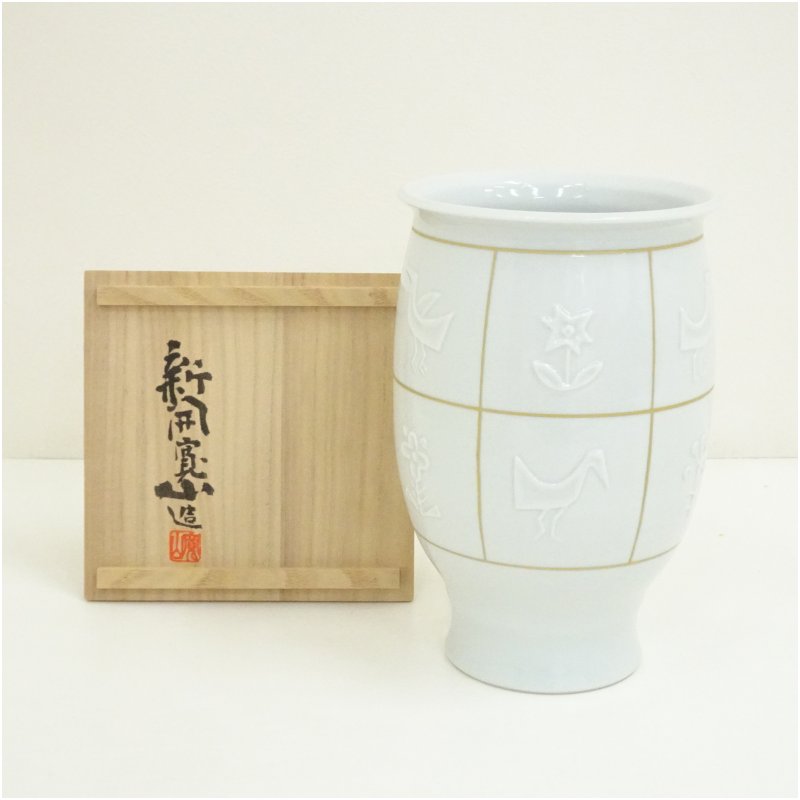 京焼 新開寛山造 白磁金彩花鳥さらさ花瓶(共箱) [13-250718c-053a]