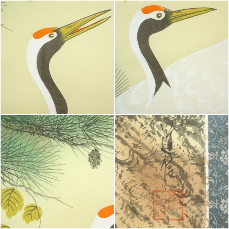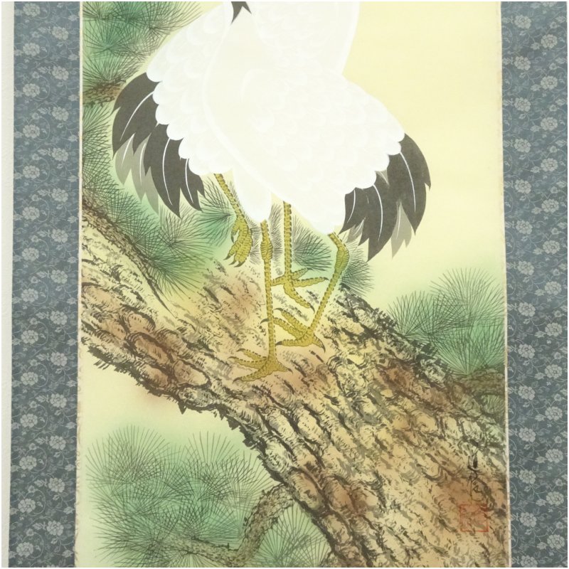道信筆 松上双鶴 肉筆絹本掛軸(共箱)