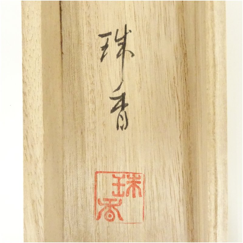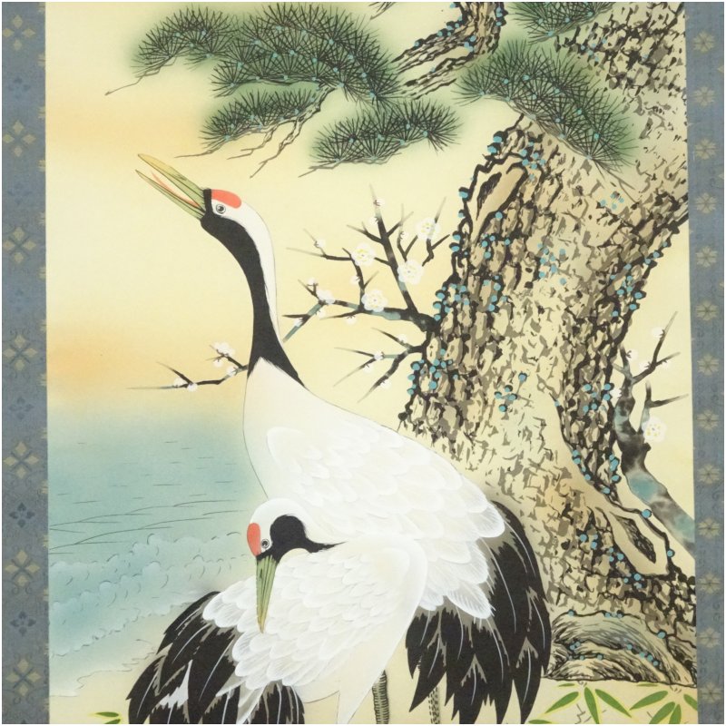 珠香筆 松竹梅鶴亀 肉筆絹本掛軸(共箱)