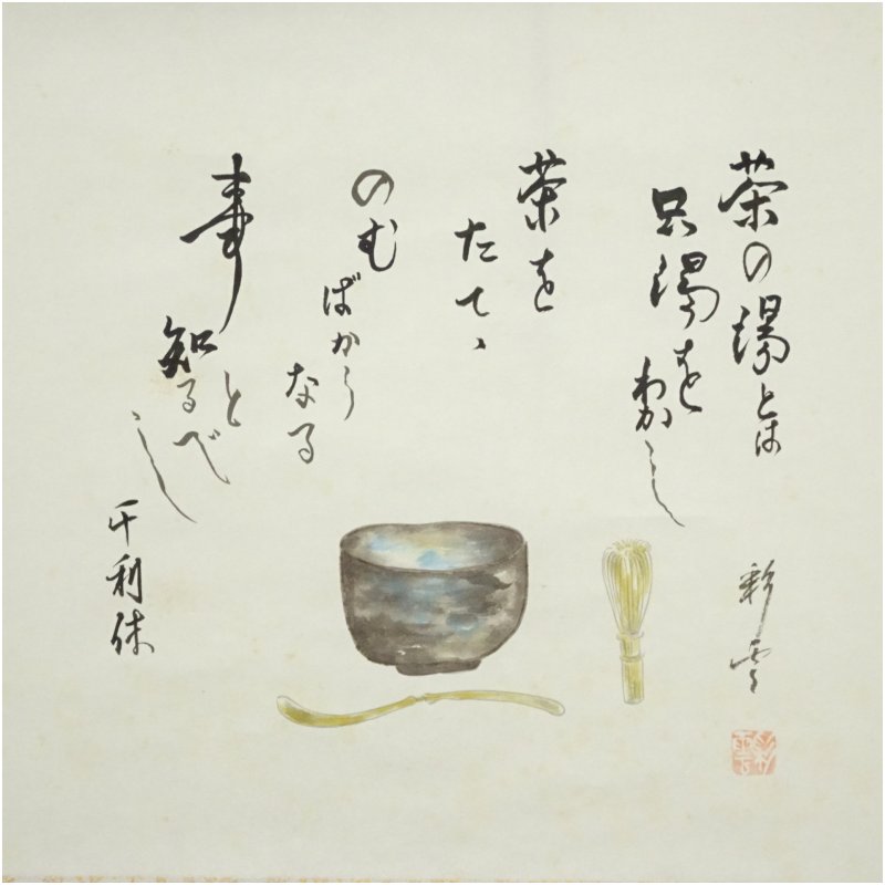 彩雲筆 利休句 茶の湯画賛 横物 肉筆紙本掛軸(共箱) [01-250725c-081a]