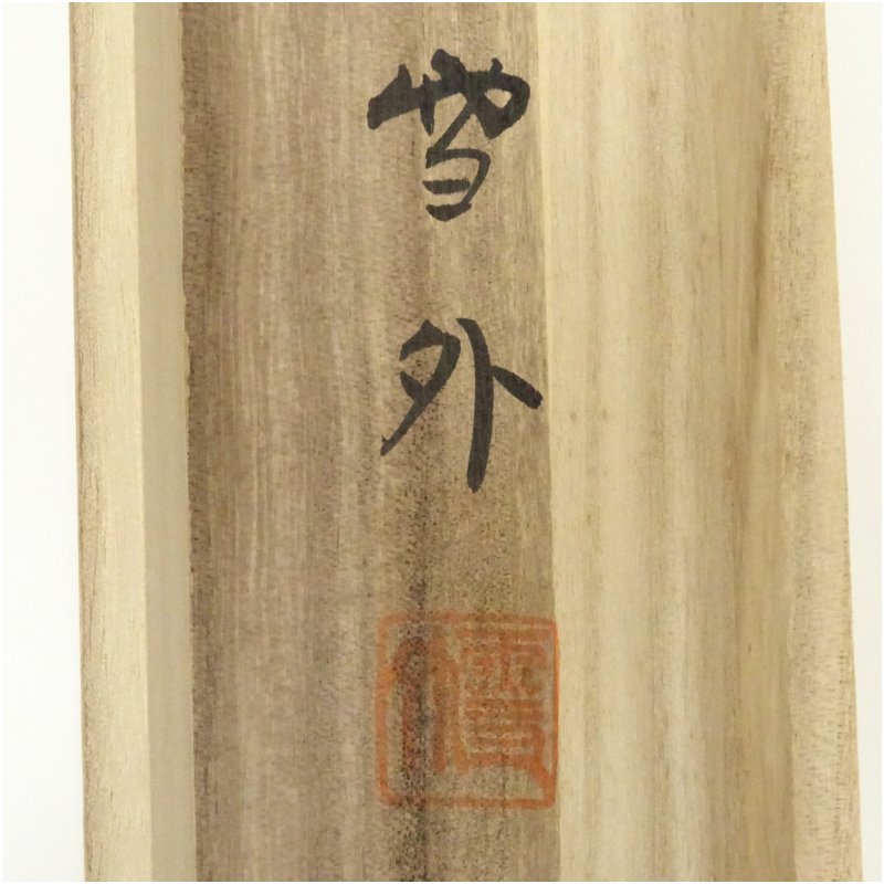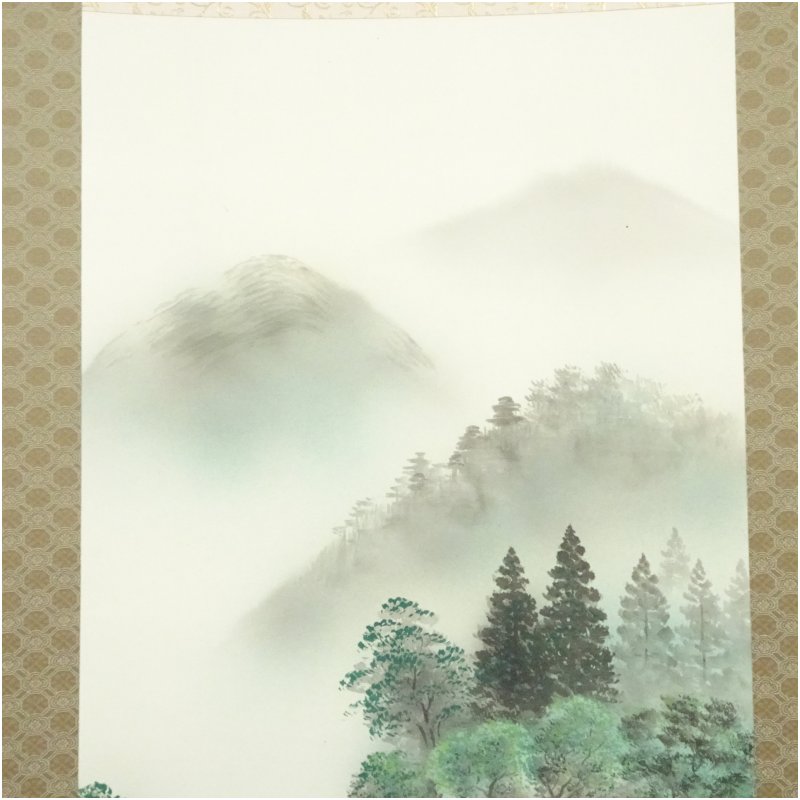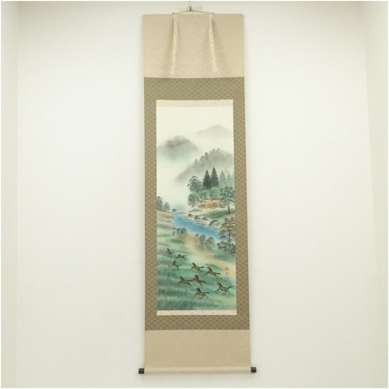 石田雪外筆 馬九行久山水 彩色山水 肉筆絹本掛軸(共箱) [01-250725c-084a]