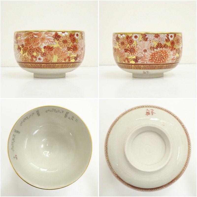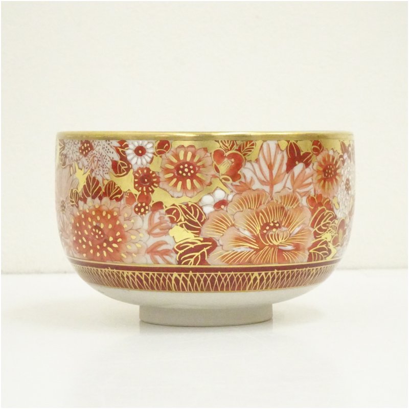 九谷焼 大雅堂造 赤絵花詰内細字茶碗(共箱)