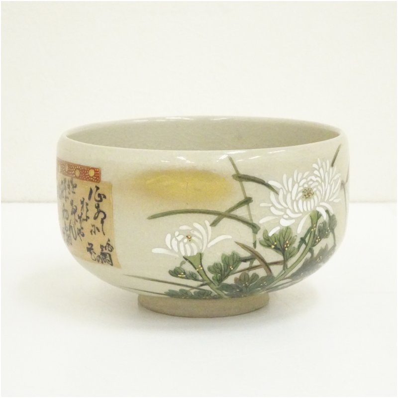九谷焼 金仙造 菊画利休茶の湯内細字茶碗(共箱)