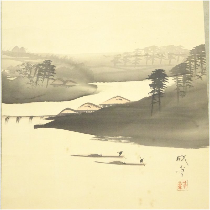 成章筆 山水図 肉筆絹本掛軸(保護箱)