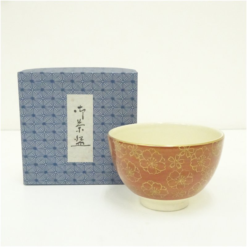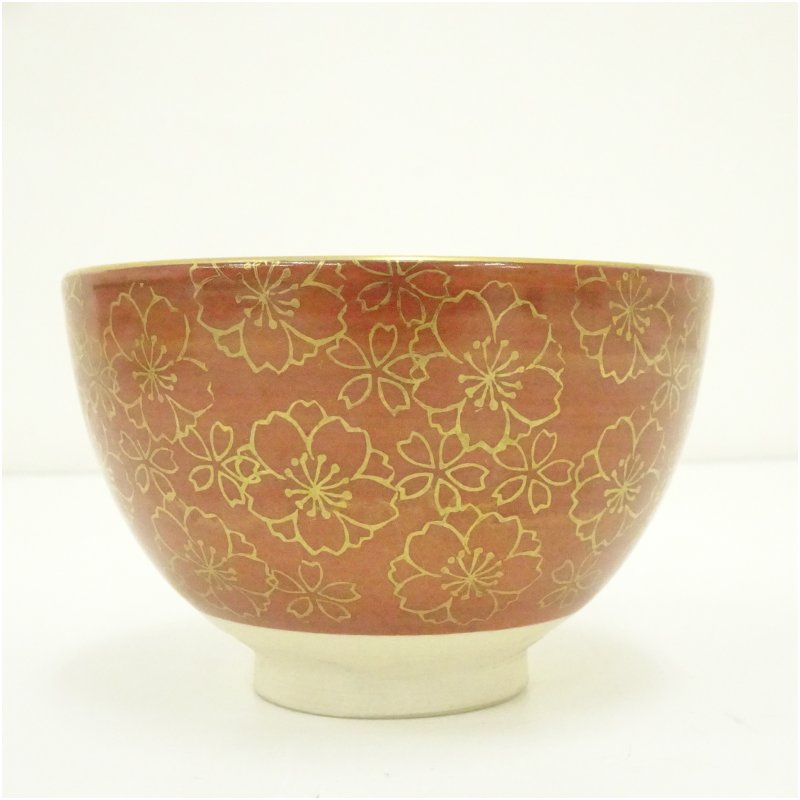 京焼 橋本永豊造 赤地金彩桜文茶碗(箱付) [01-250801c-028a]