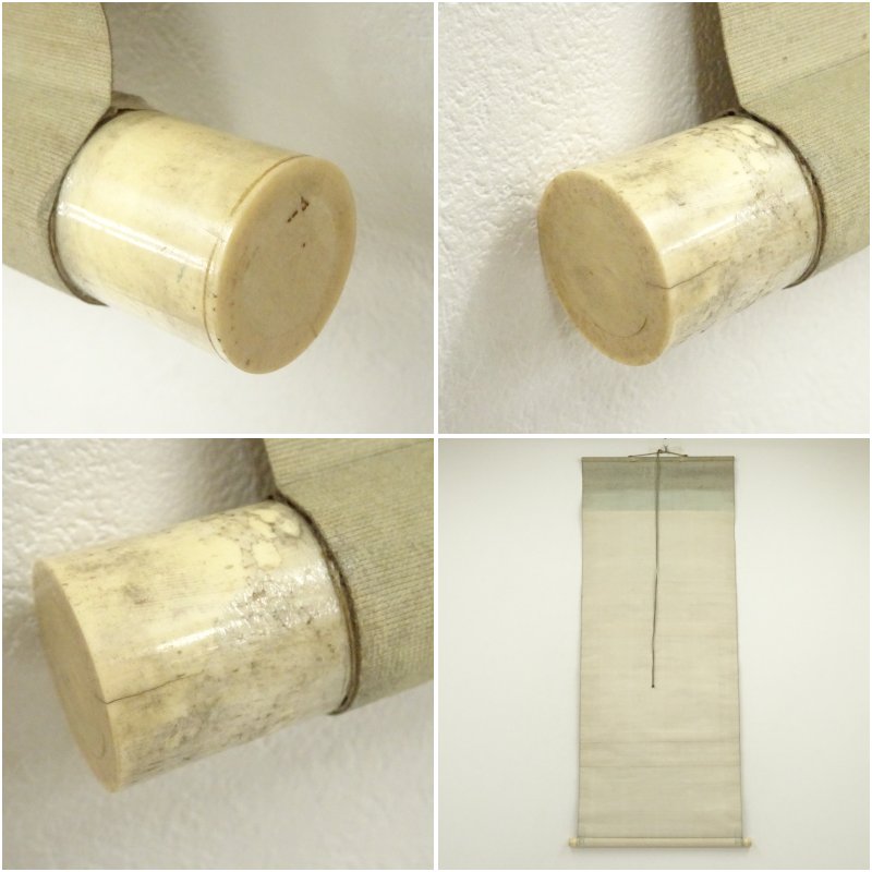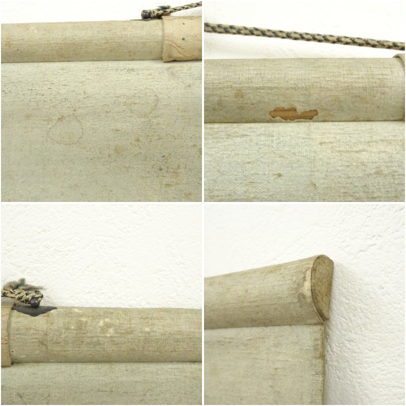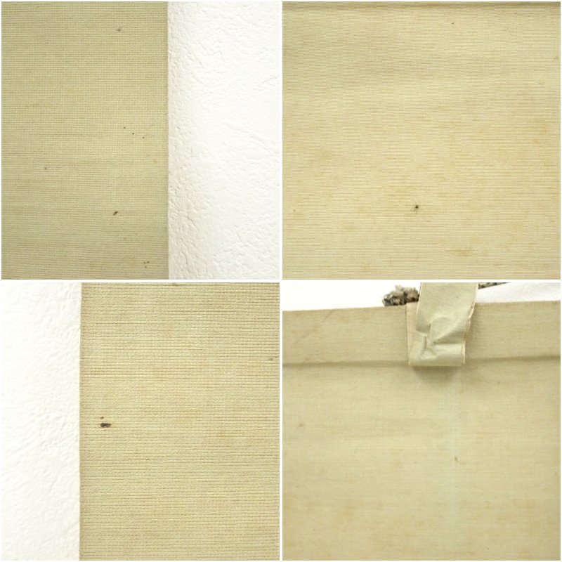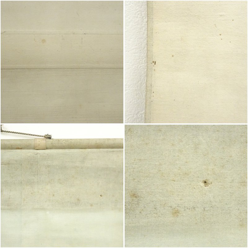 本紙と表具両面にシミ、汚れ、ヤケ、虫食いなどの経年による劣化があります。