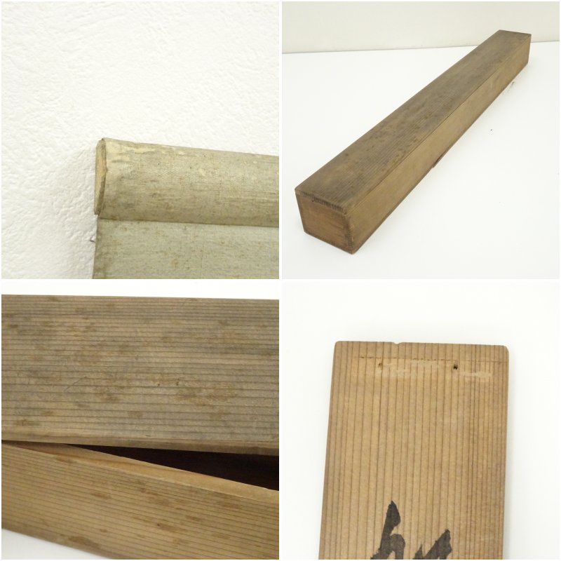 木箱にシミがあり、蓋の桟が片方欠損しています。