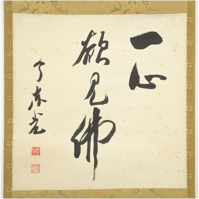 1970年 今東光筆 「一心観見佛」 肉筆色紙掛軸(共箱)
