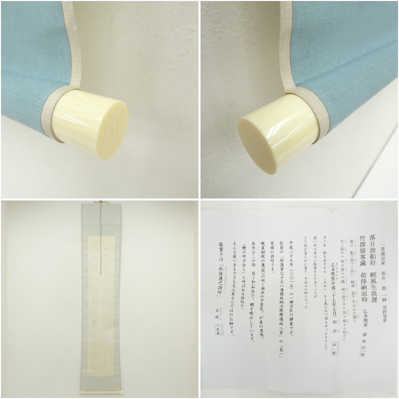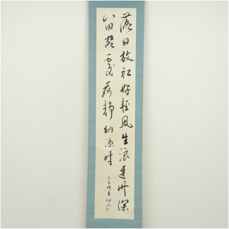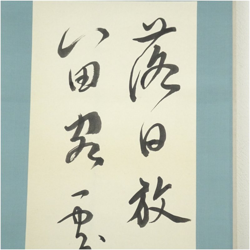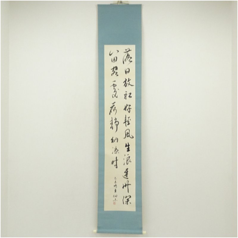 一茶庵 佃一輝(亦石)筆 「杜陵蓮之詩句」二行書 肉筆紙本掛軸(共箱) [12-250814c-003a]