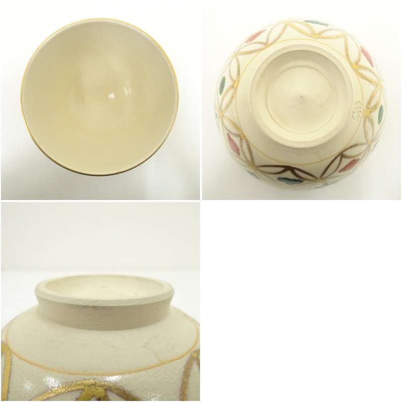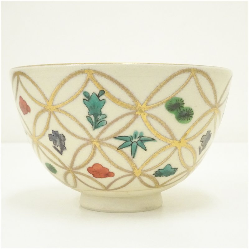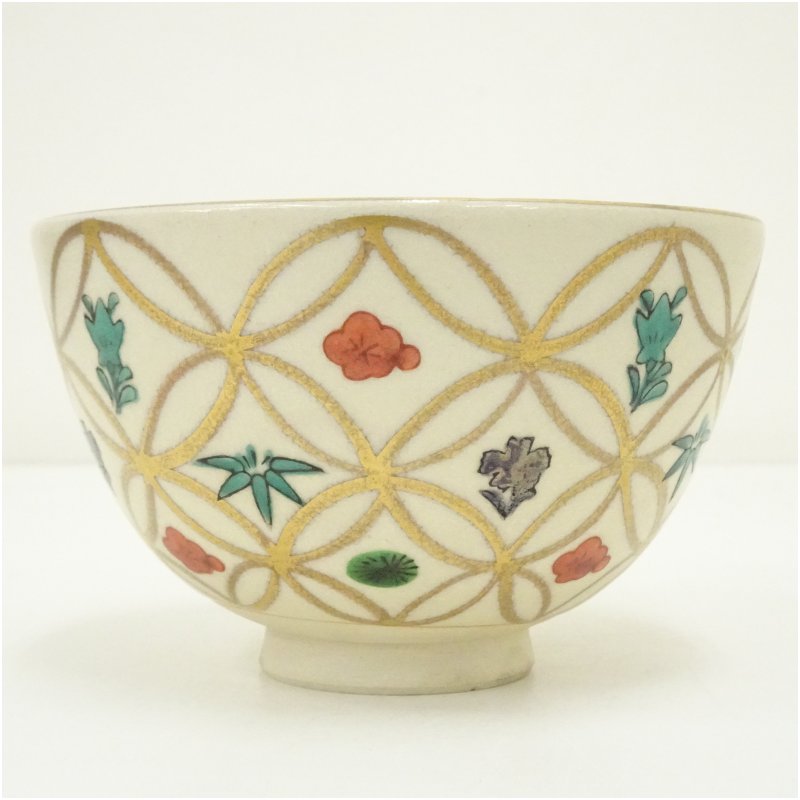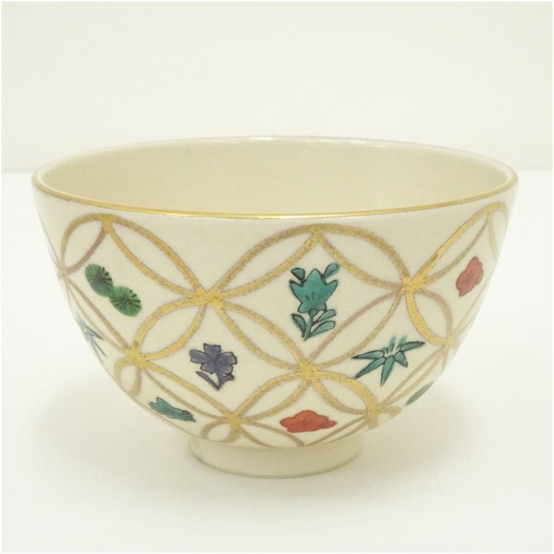 京焼 川添寿楽造 色絵七宝繋草花文茶碗 [01-250814c-042a]