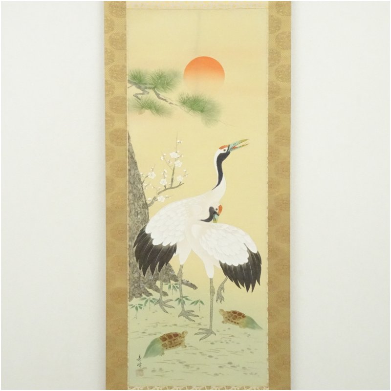 寿峰筆 鶴亀 肉筆絹本掛軸(共箱) [01-250815c-005a]
