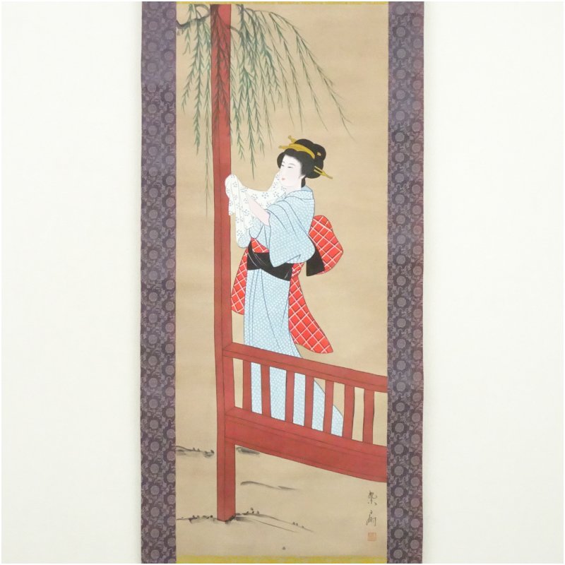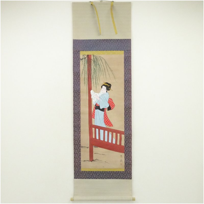 紫扇筆 美人図 肉筆絹本掛軸(保護箱)