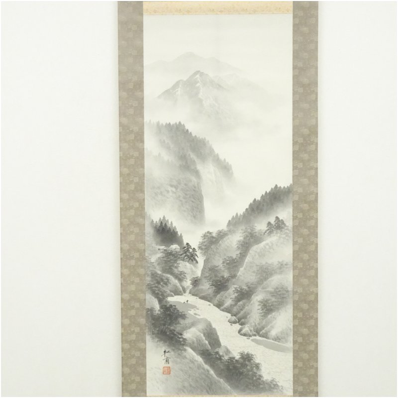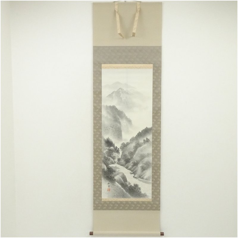 田中松甫筆 水墨山水 肉筆絹本掛軸(共箱) [01-250815c-015a]