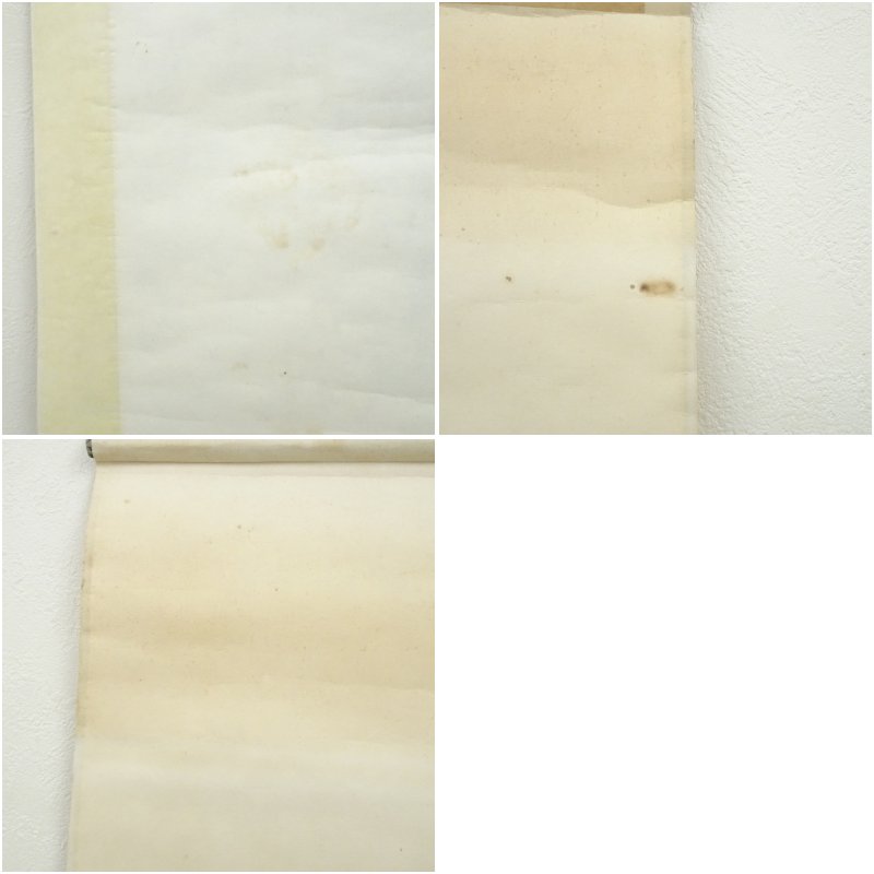 表具:表面にシミと汚れが数ケ所あります。巻き皺による折れが複数あります。裏面にところどころシミがあり、上部にヤケと貼り紙があります。