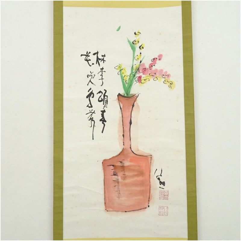 東大寺 清水公照筆 壺之花画賛 肉筆紙本掛軸(共箱) [14-250818c-018a]