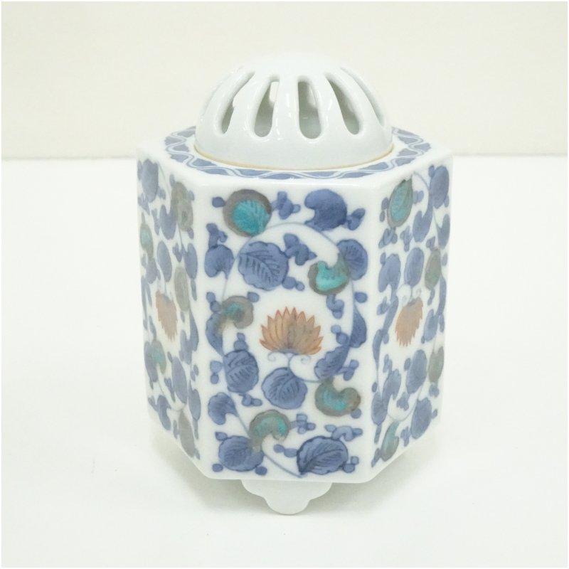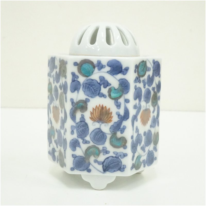 鍋島焼 小笠原長春造 牡丹唐草六角香炉(共箱) [13-250818c-055a]