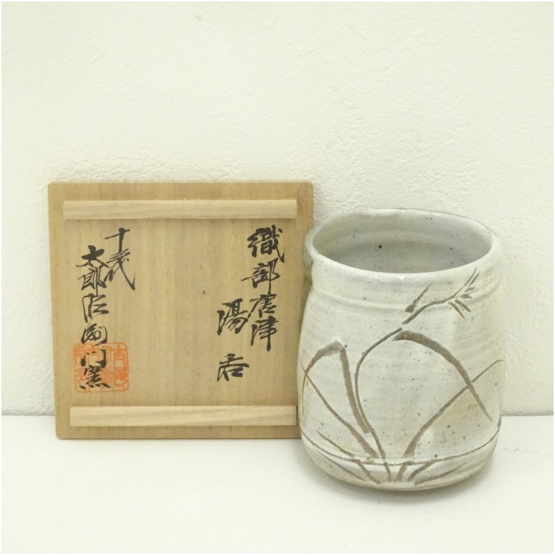 唐津焼 十三代 中里太郎右衛門窯造 織部唐津湯呑(共箱)