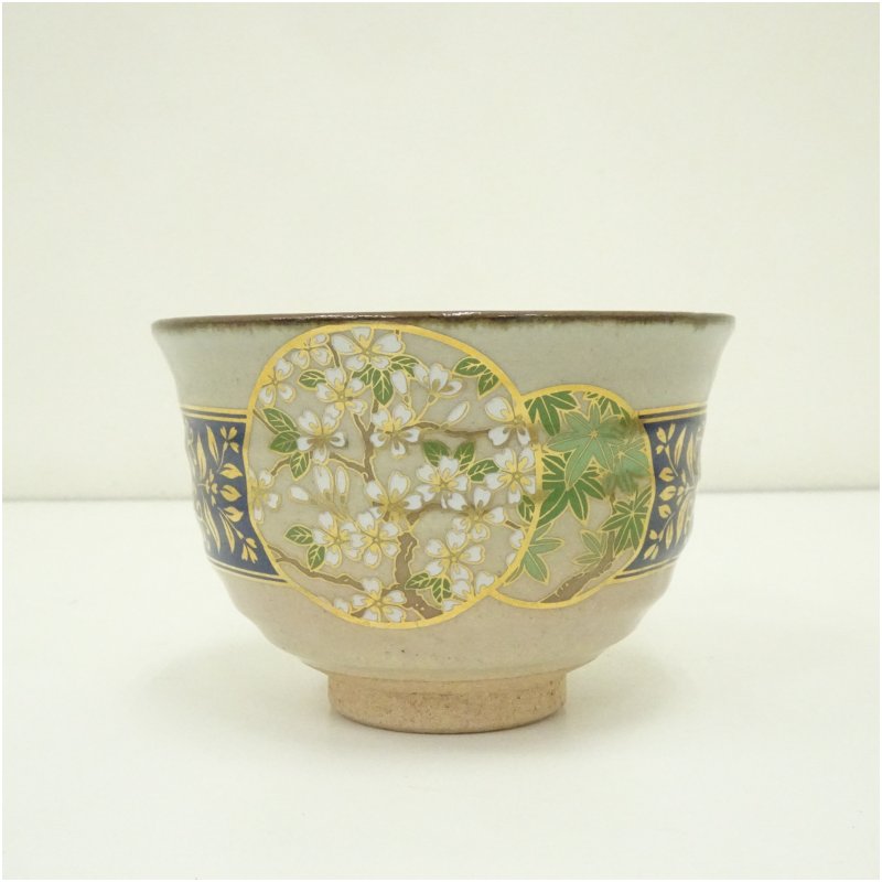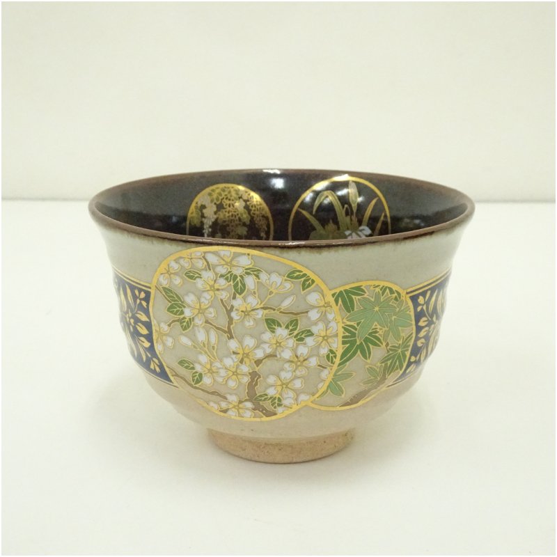 作家物 色絵帯丸紋草花画茶碗(箱付)