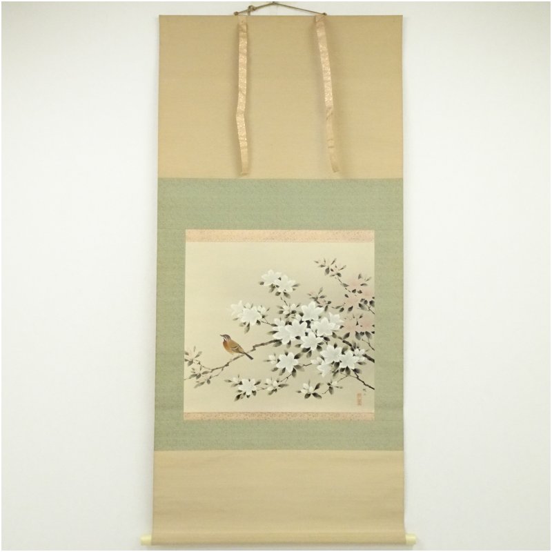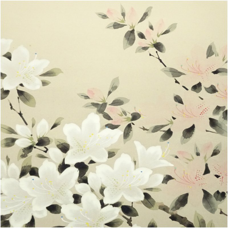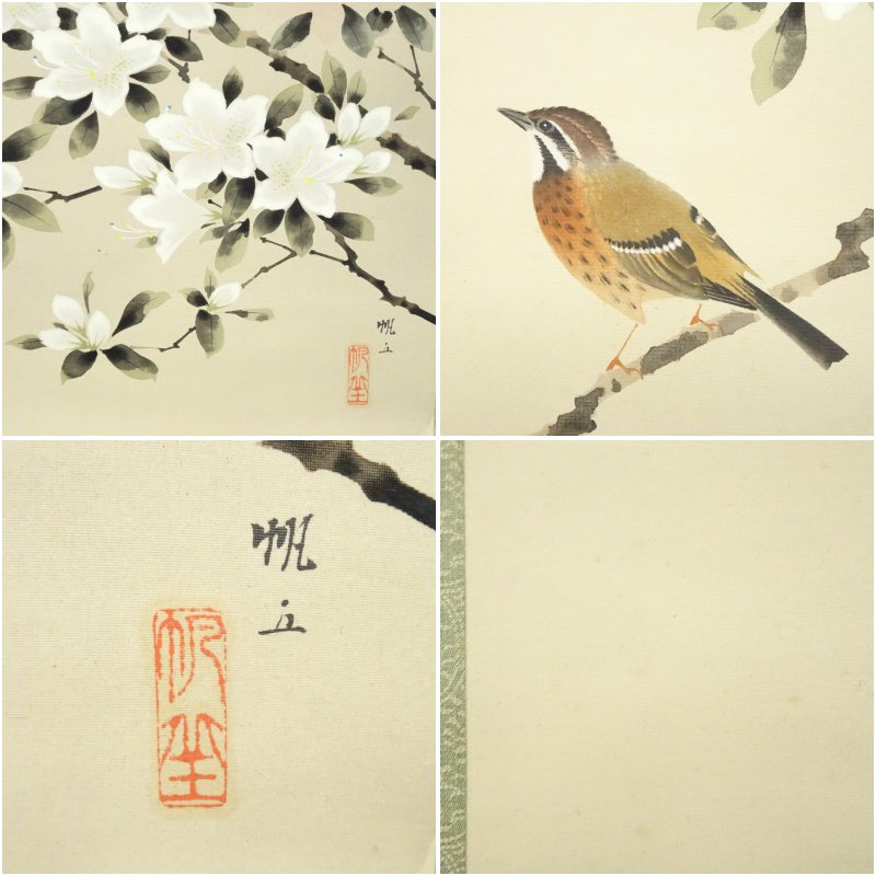 山田帆丘筆 躑躅小禽 肉筆絹本掛軸(共箱) [01-250821c-022a]