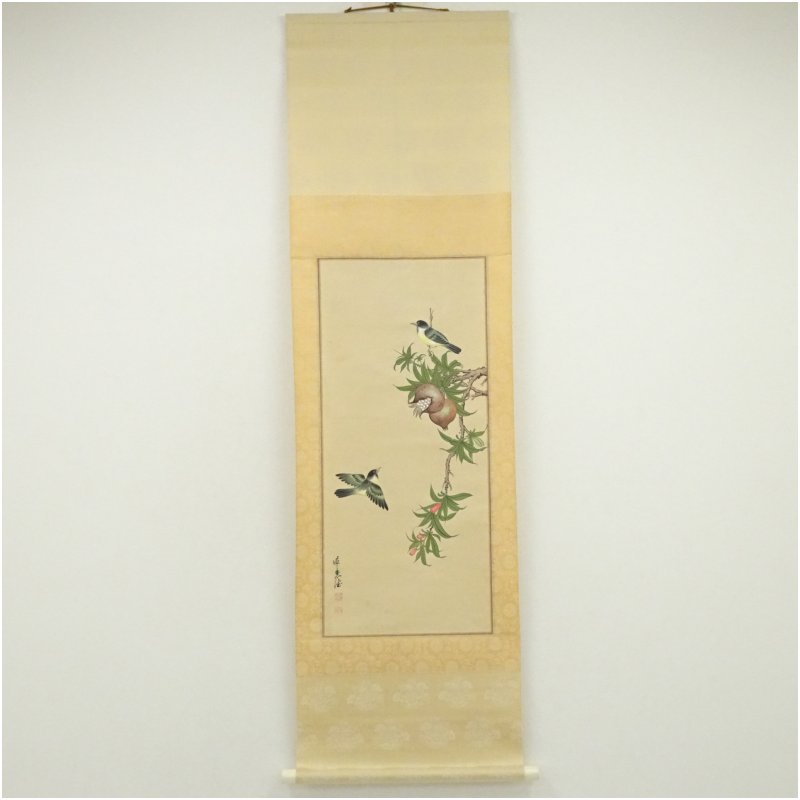 藍恵筆 柘榴に小禽 肉筆絹本掛軸 [01-250822c-022a]