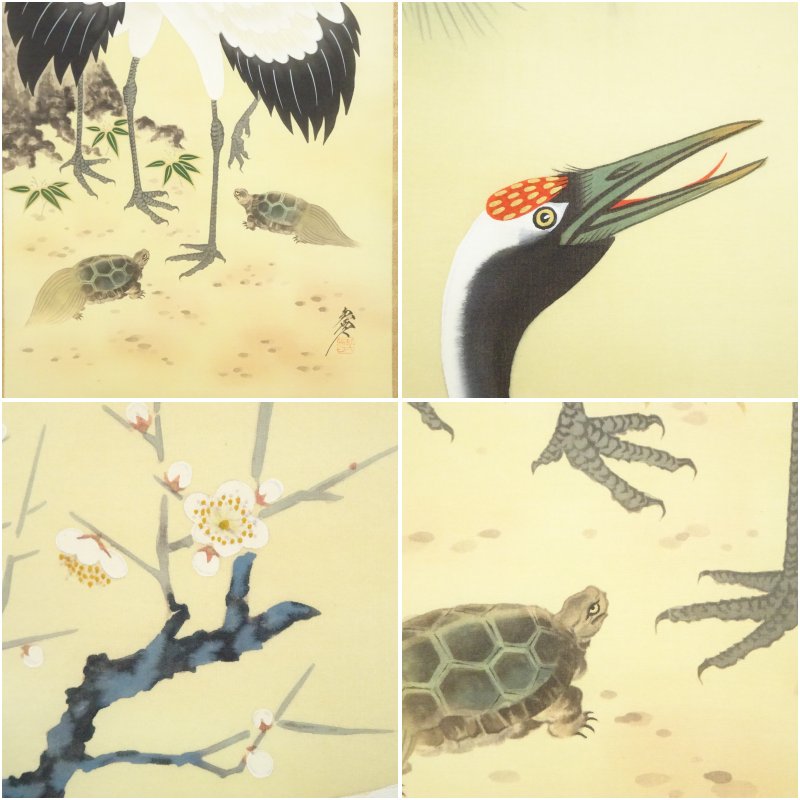 契雪筆 松竹梅鶴亀 肉筆絹本掛軸(共箱) [01-250825c-019a]
