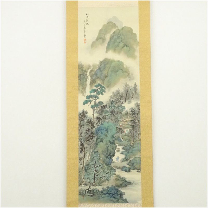 宮瀬泉城筆 林渓幽隠 彩色山水 肉筆絹本掛軸(共箱) [01-250826c-006a]