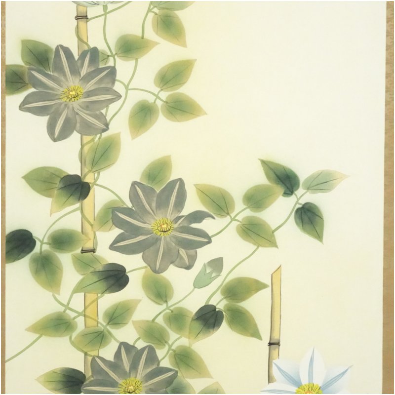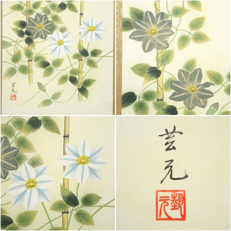 芸元筆 鉄仙花 肉筆絹本掛軸(共箱)