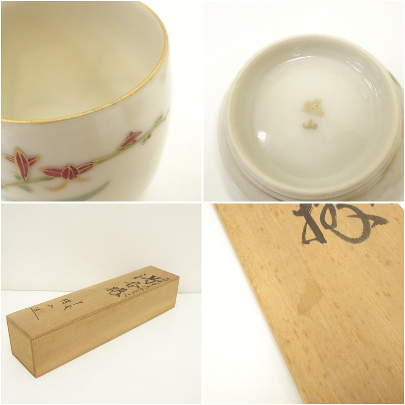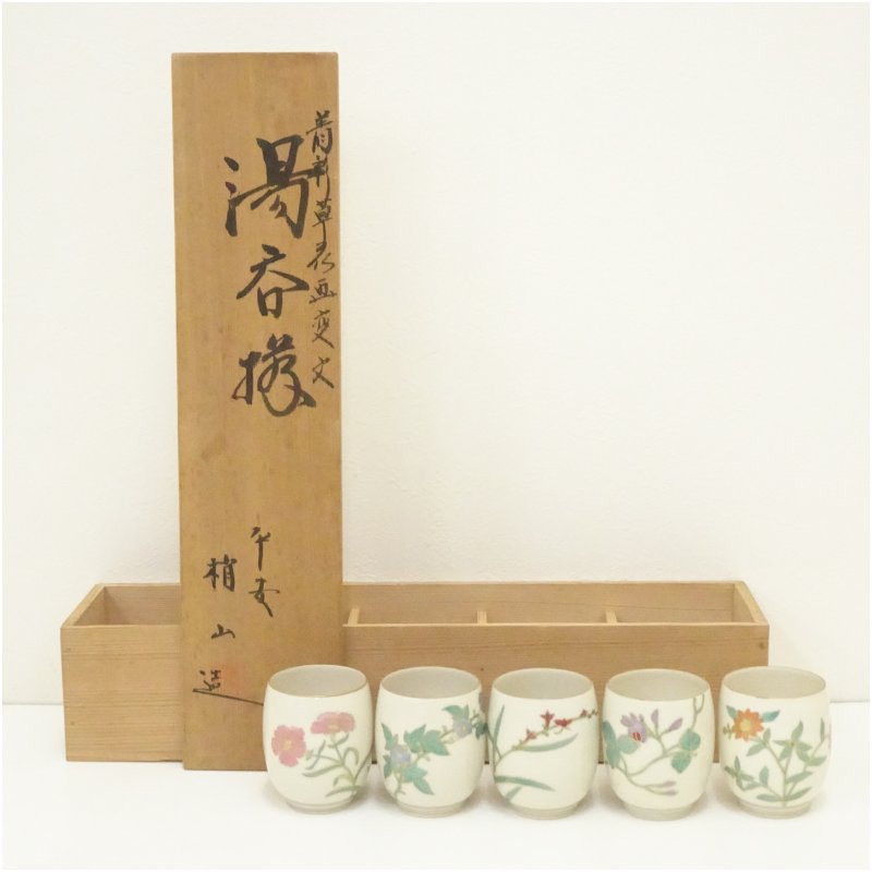 梢山造 着彩草花文図変り湯呑5客揃(共箱)