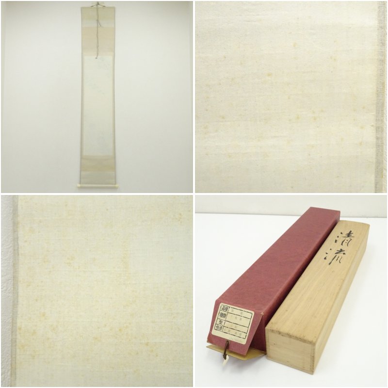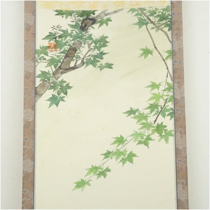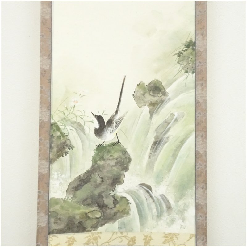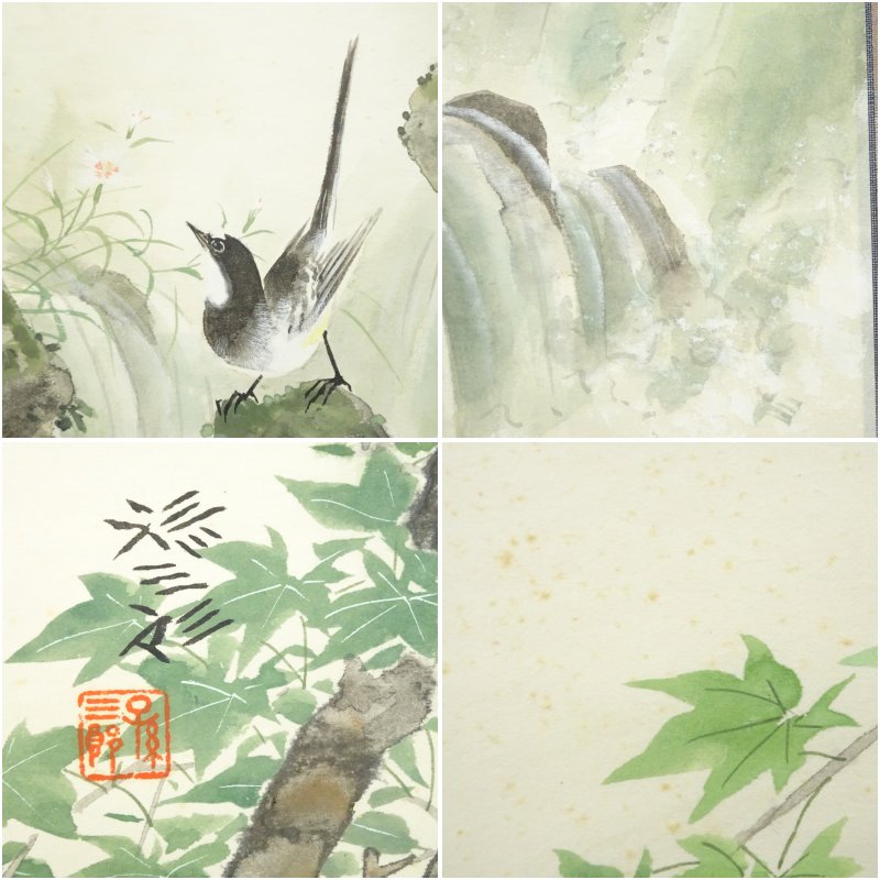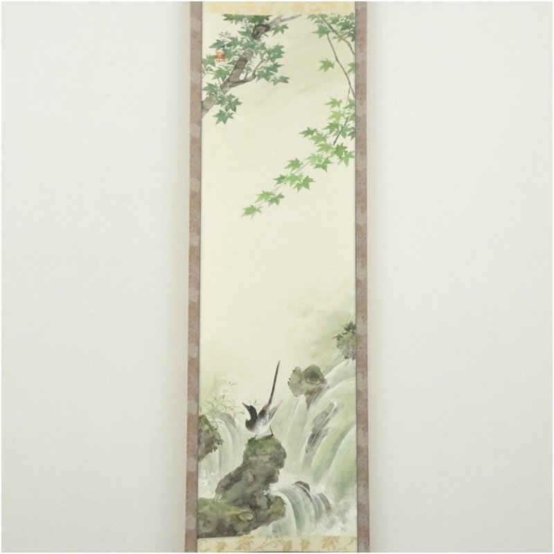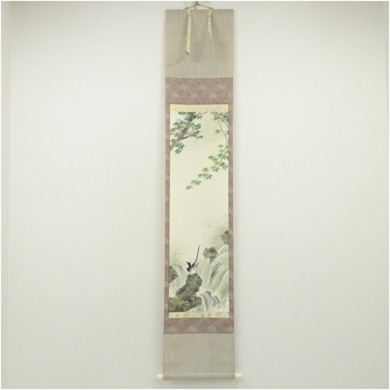 大路孫三郎筆 清流 青楓に小禽 肉筆絹本掛軸(共箱) [01-250828c-059a]