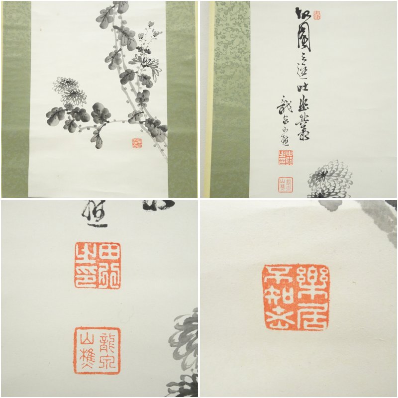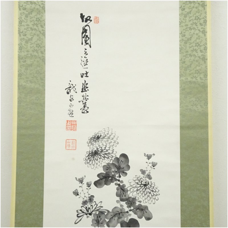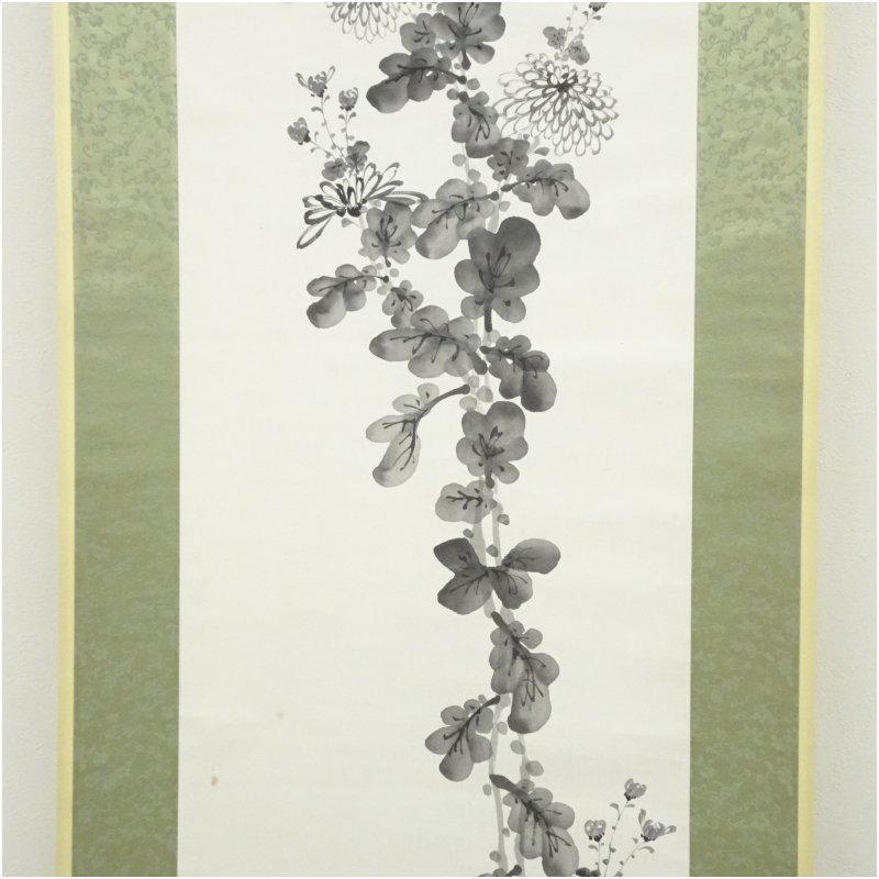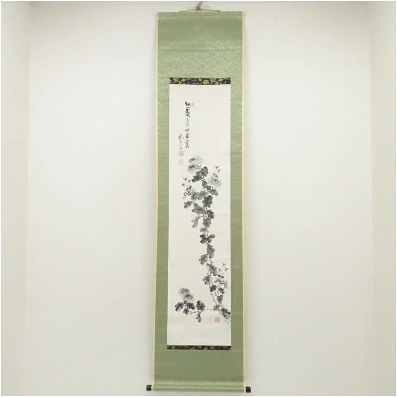 龍泉筆 水墨 菊図 肉筆紙本掛軸(保護箱) [01-250828c-048a]