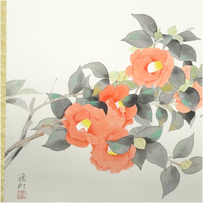 内田逸郎筆 椿 肉筆絹本掛軸(保護箱)
