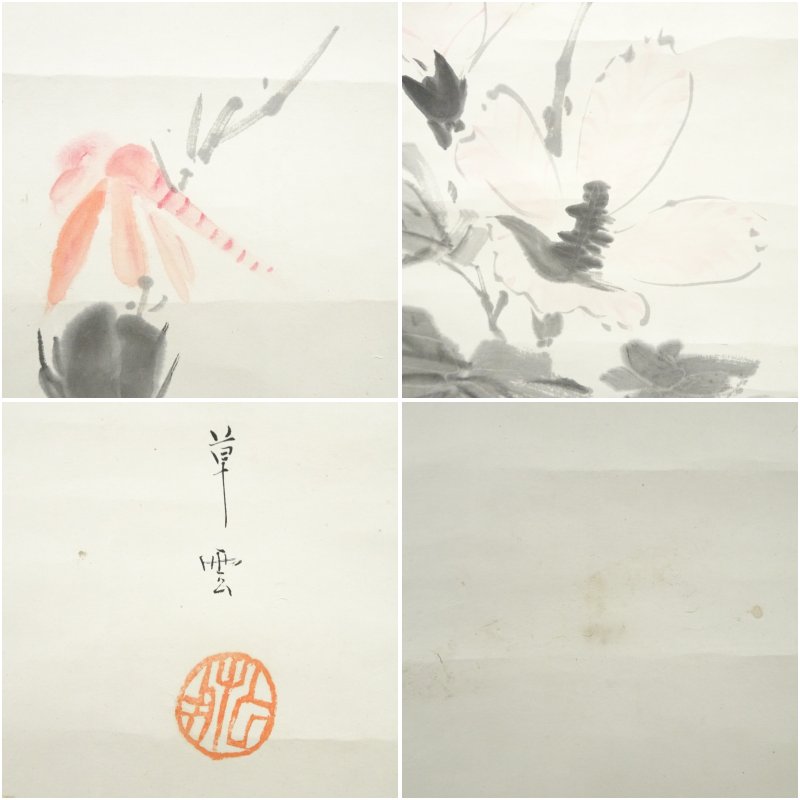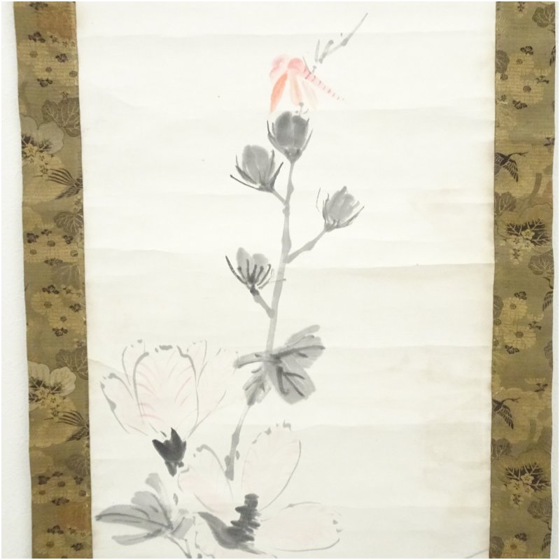 草雲筆 水墨 花鳥図 肉筆紙本掛軸(保護箱)