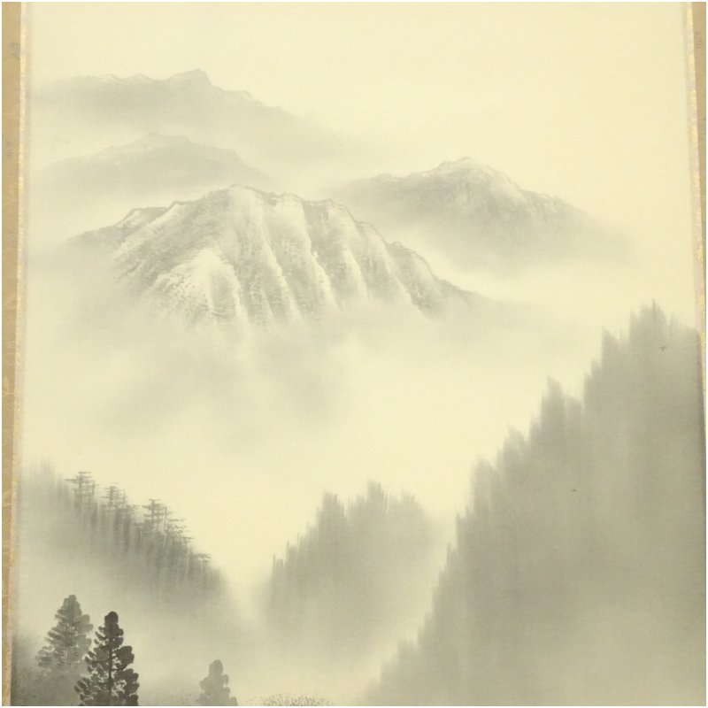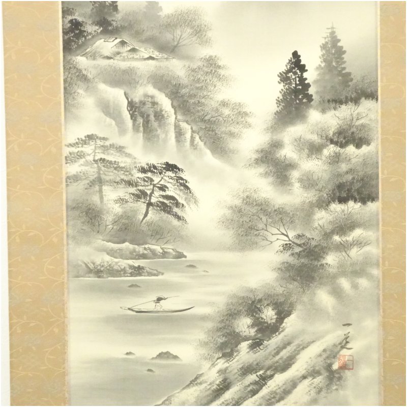 一道筆 水墨山水 肉筆絹本掛軸(共箱) [01-250901c-005a]