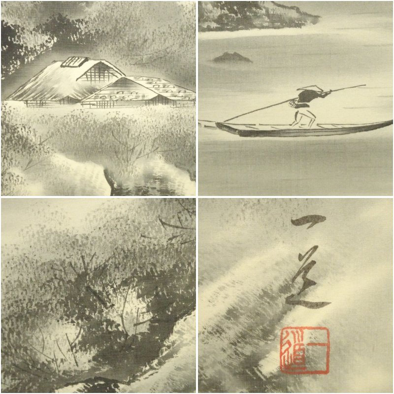 一道筆 水墨山水 肉筆絹本掛軸(共箱)