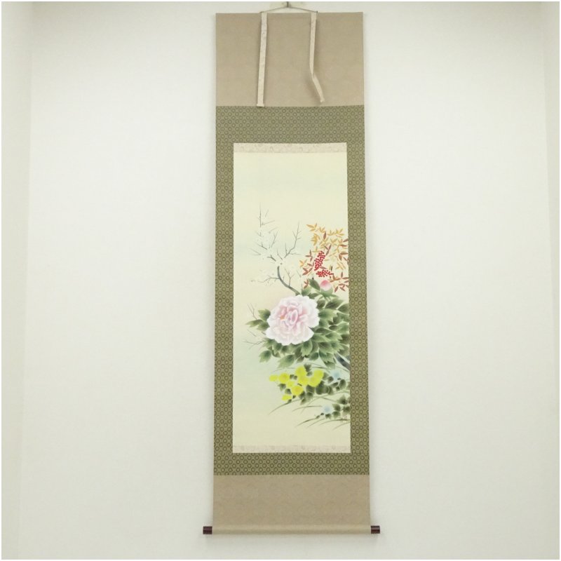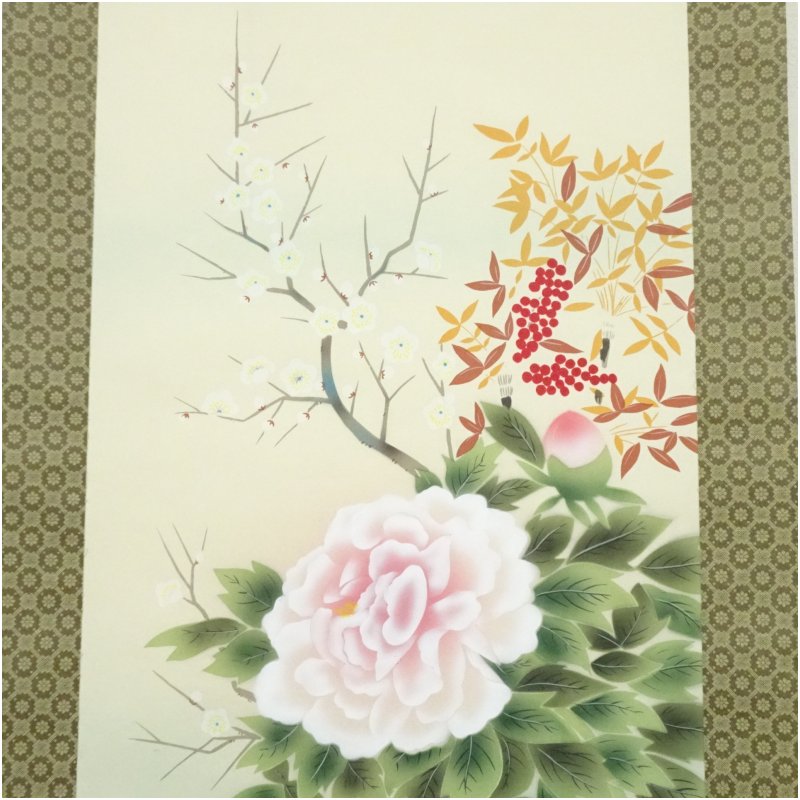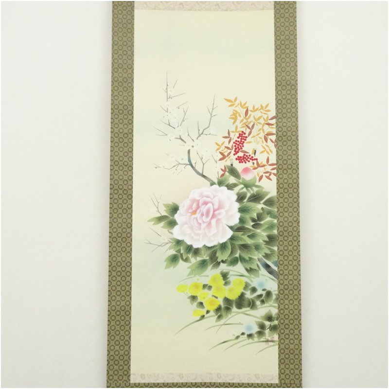 珠香筆 四季花 肉筆絹本掛軸(共箱) [01-250901c-033a]