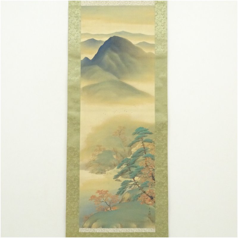 石井早沖筆 秀嶺翠壁 彩色山水 肉筆絹本掛軸 [01-250901c-055b]