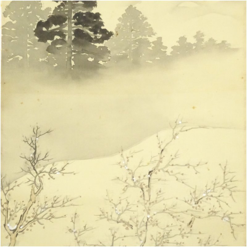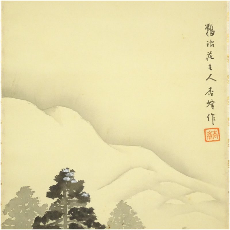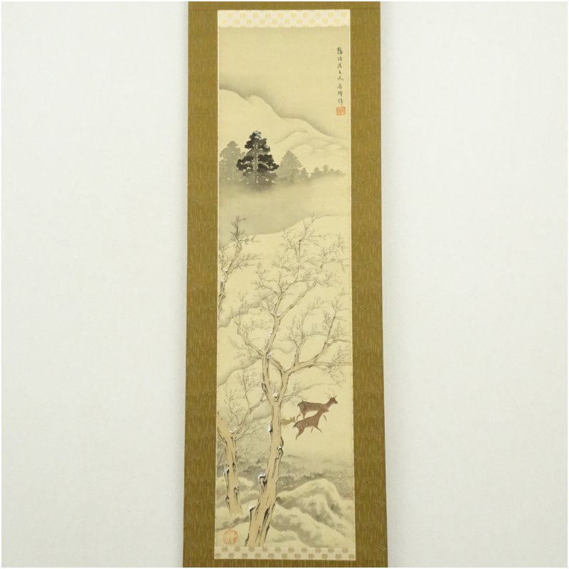 宮脇杏峰筆 子鹿連れ 雪中風景 肉筆絹本掛軸 [01-250901c-057a]