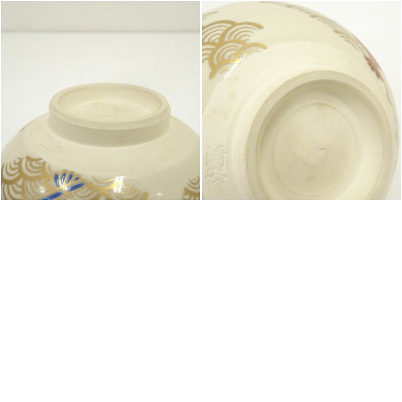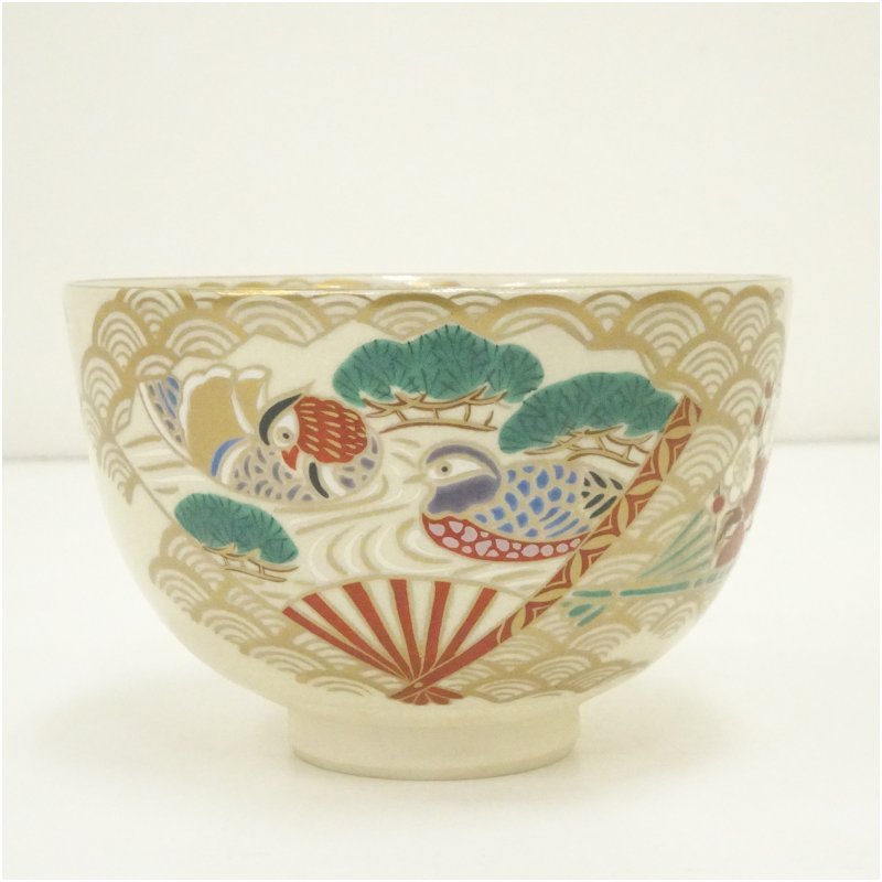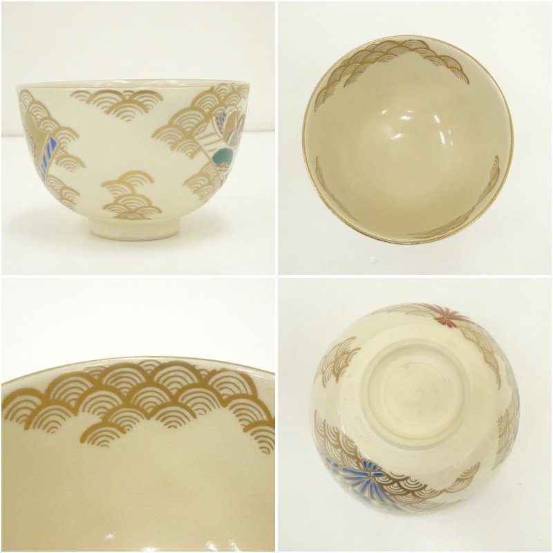 京焼 鈴木清安造 色絵青海波に扇面茶碗 [13-250903c-028a]