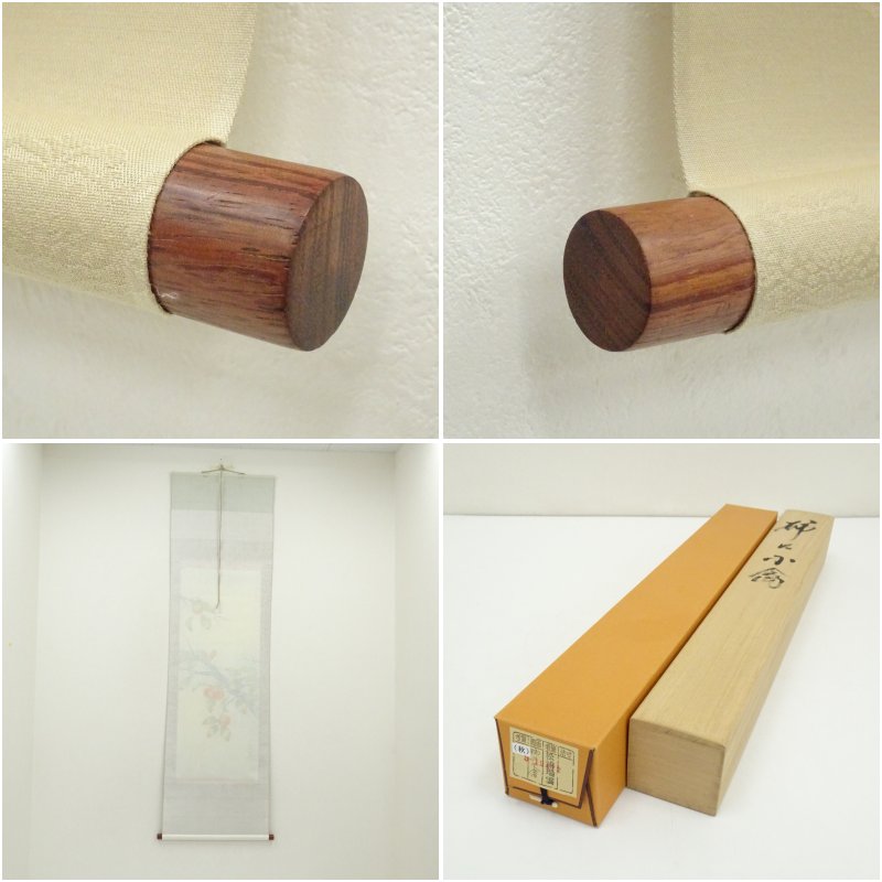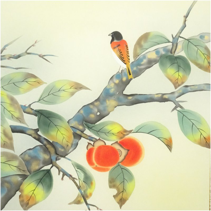 松浦瑞雲筆 柿に小禽 肉筆絹本掛軸(共箱) [01-250903c-078a]
