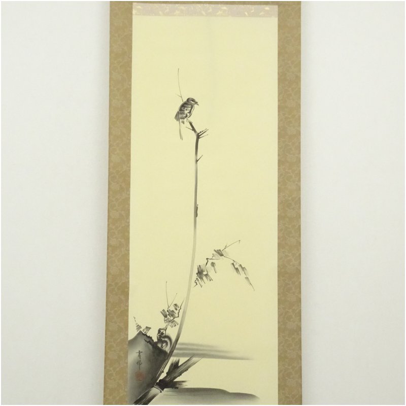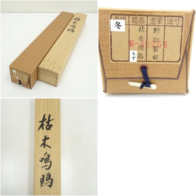 野田雪邨筆 宮本武蔵写 枯木鳴鵙 肉筆絹本掛軸(共箱) [01-250903c-081a]