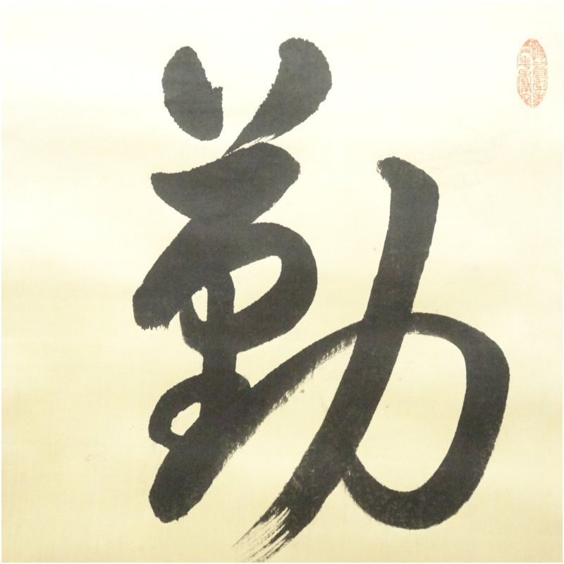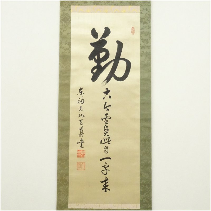 東福寺 広田慈教(天真)筆 「勤」一行書 肉筆絹本掛軸(保護箱) [14-250918c-023a]